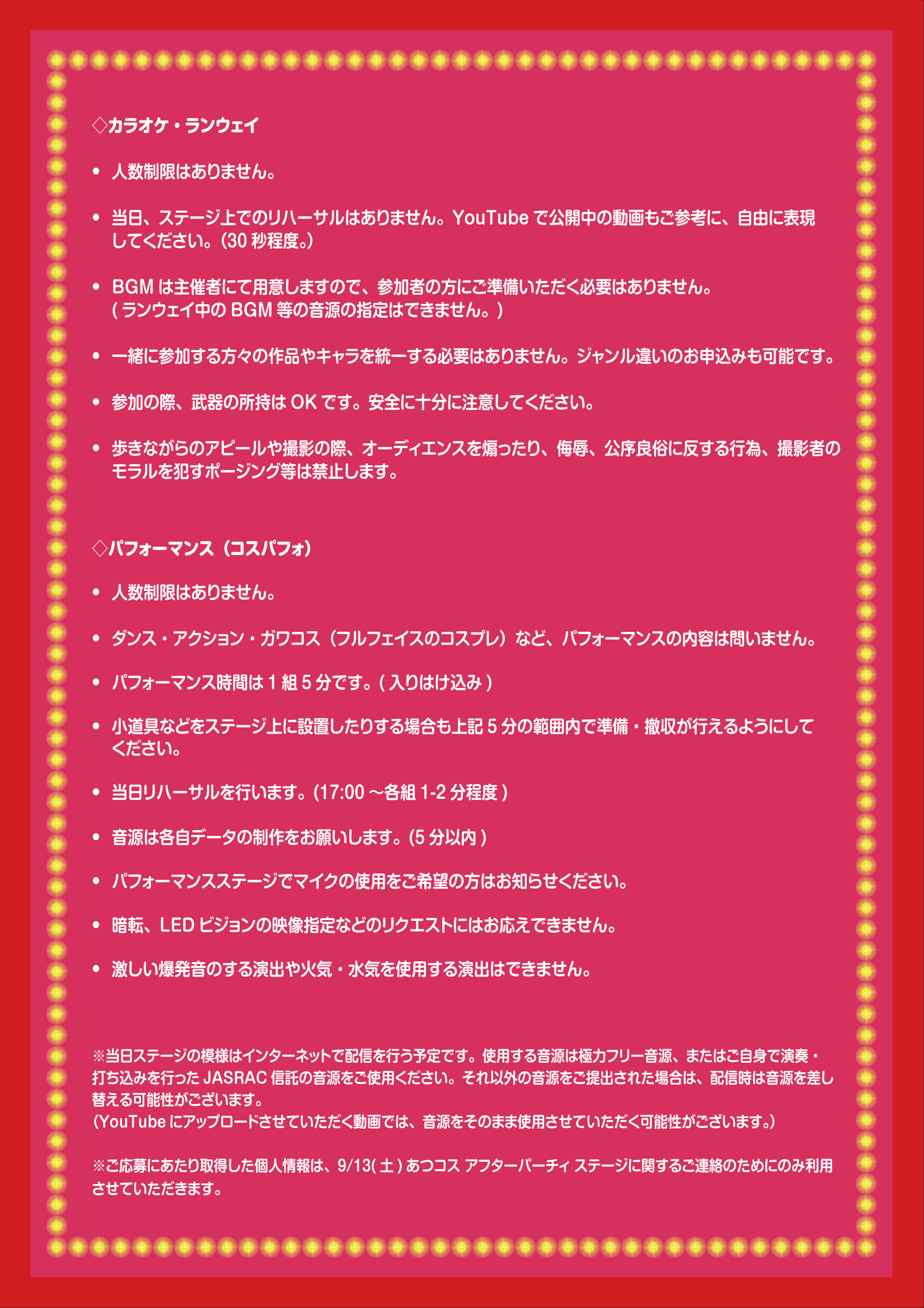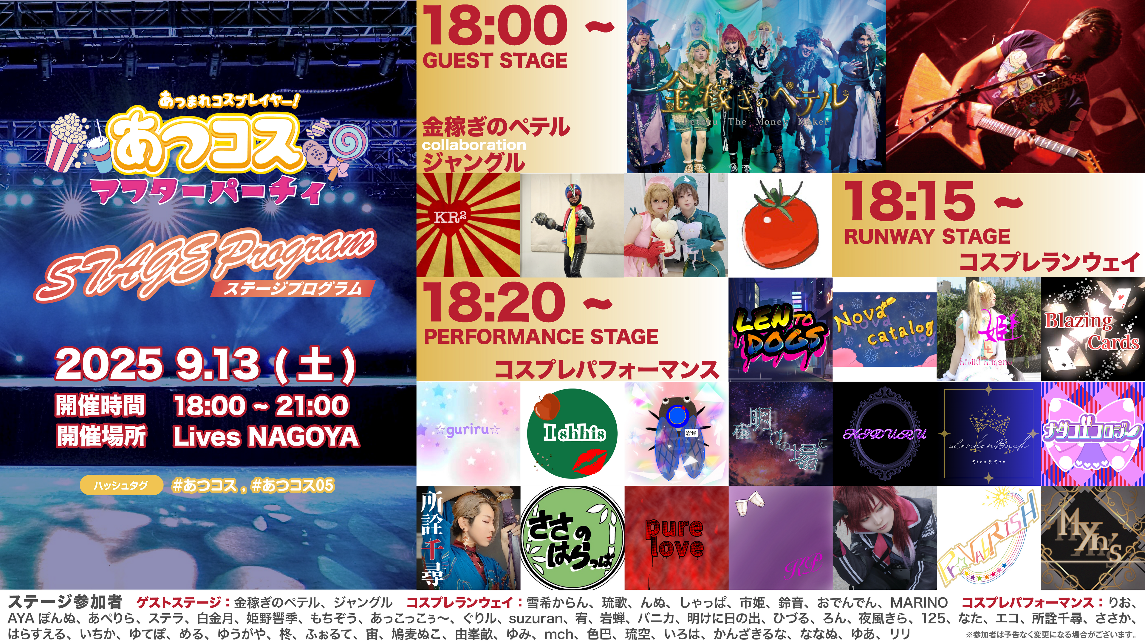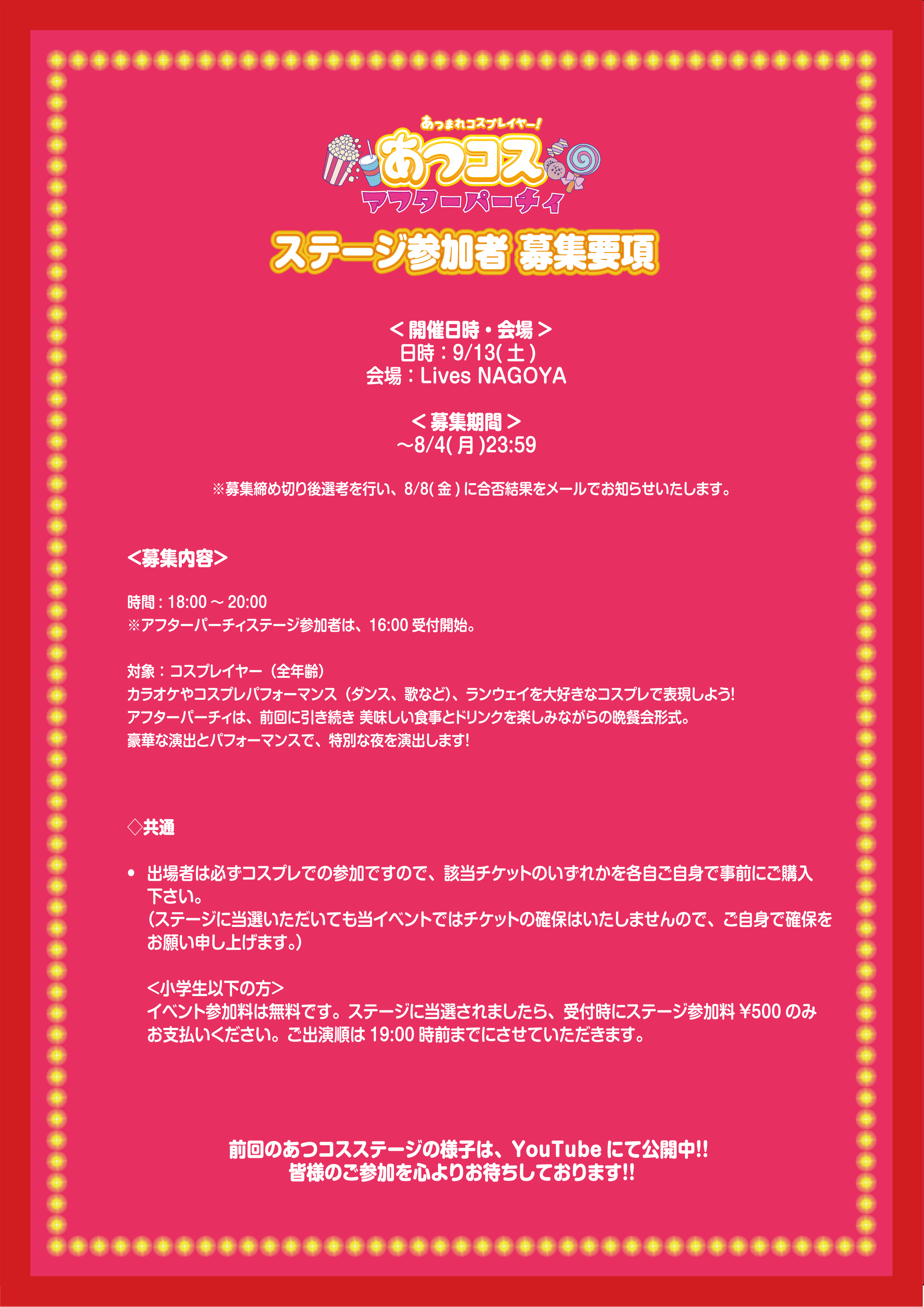 アフターパーチィステージ参加者のご応募は、締め切らせていただきました。