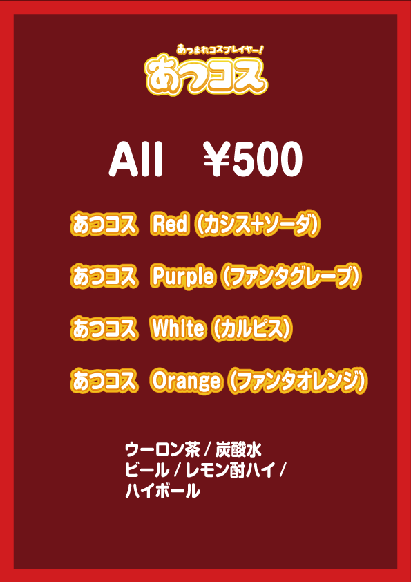 コーヒー(HOT/ICE)、ティー(HOT/ICE)、コーラ、メロンソーダ、アセロラ、アセロラソーダ、ソーダ、オレンジ、ウーロン茶、緑茶